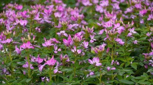 - Spider flower. To 5 feet or more. Easy, old fashioned annuals which, despite their thorny stems and rank odor, are among the most popular large annuals for specimens and mass bedding, especially in parks and commercial landscapes. Reseeds readily, with flowers in large coymbs ranging from white through all shades of pink, rose and purple.