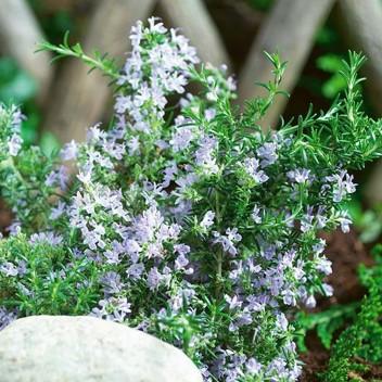 - Rosemary, interchangeable as an herb or an ornamental perennial (where hardy). Forms vary from the typical pyramidal uprights to creeping, prostrate types. Flowers, typically light blue, can be white or pink as well. Some clones are also noted for heavy flowering. A few selections are hardy to Zones 7 or 6.